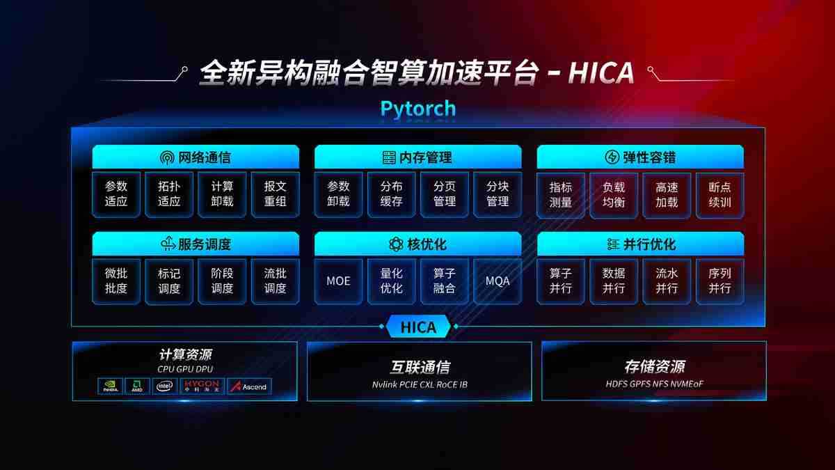 通过自研的服务层、、、中间适配层、、、以及调度编排算法,,,,采用数据并行、、、、模型并行等多种并行方式,,把并行计算任务进行有效的分解,,,使其分别由相应的软件栈和算力资源来承接。。当GPU资源变化,,,,HICA可以实时动态调度计算子任务并调整模型拓扑和架构,,,以充分聚合各种算力资源。。。。