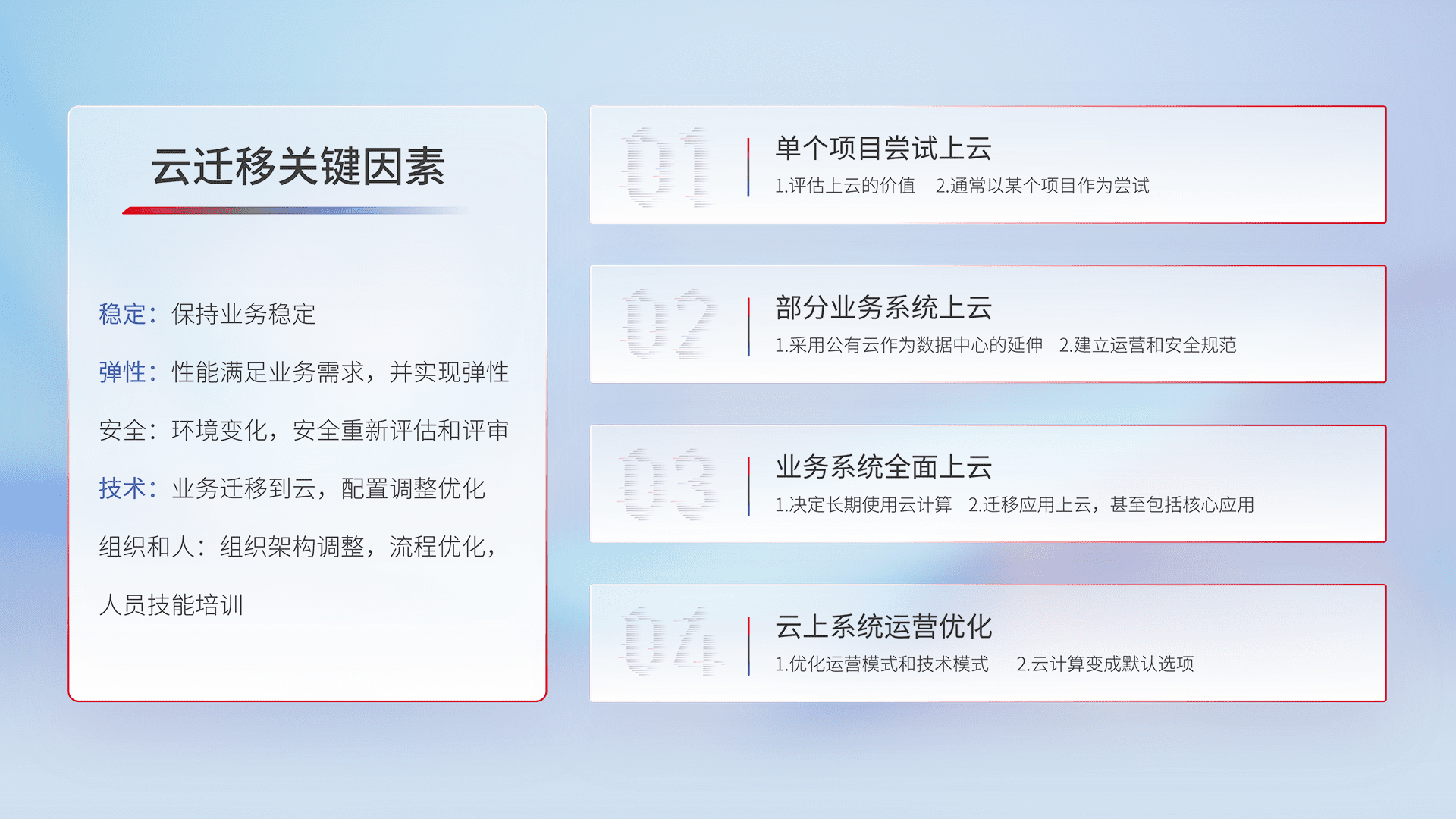 结合实际业务,,从规划设计、、云平台选型、、云原生改造、、、、数据迁移、、、、集成交付,,,迁移全过程为客户识别最佳上云路径,,,做好风险识别管理,,,设计网络架构、、身份权限、、、安全审计合规、、操作审计、、日志审计、、、、监控告警策略、、多站点容灾设计等,,对云上基础设施进行整体规划,,提升IT治理水平,,,,以满足弹性、、、高可用、、、高性能的需求。。。