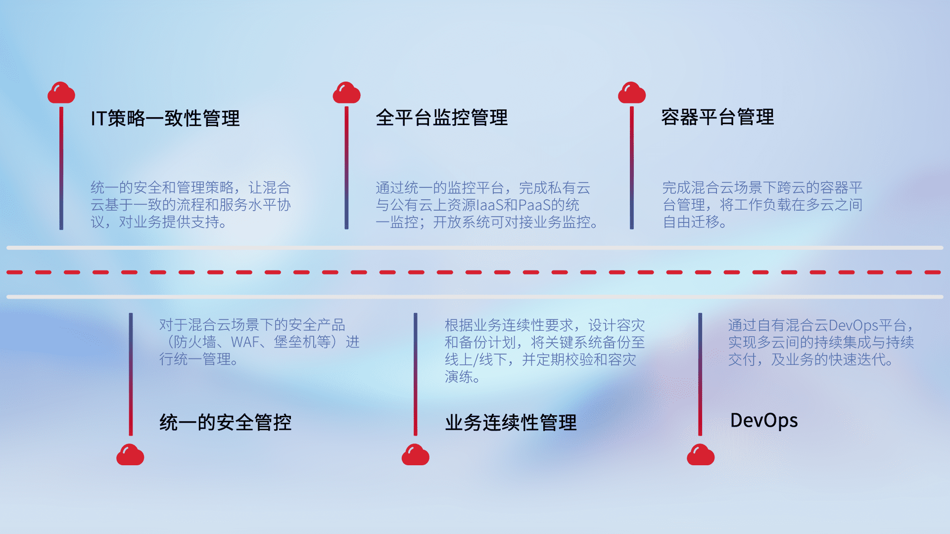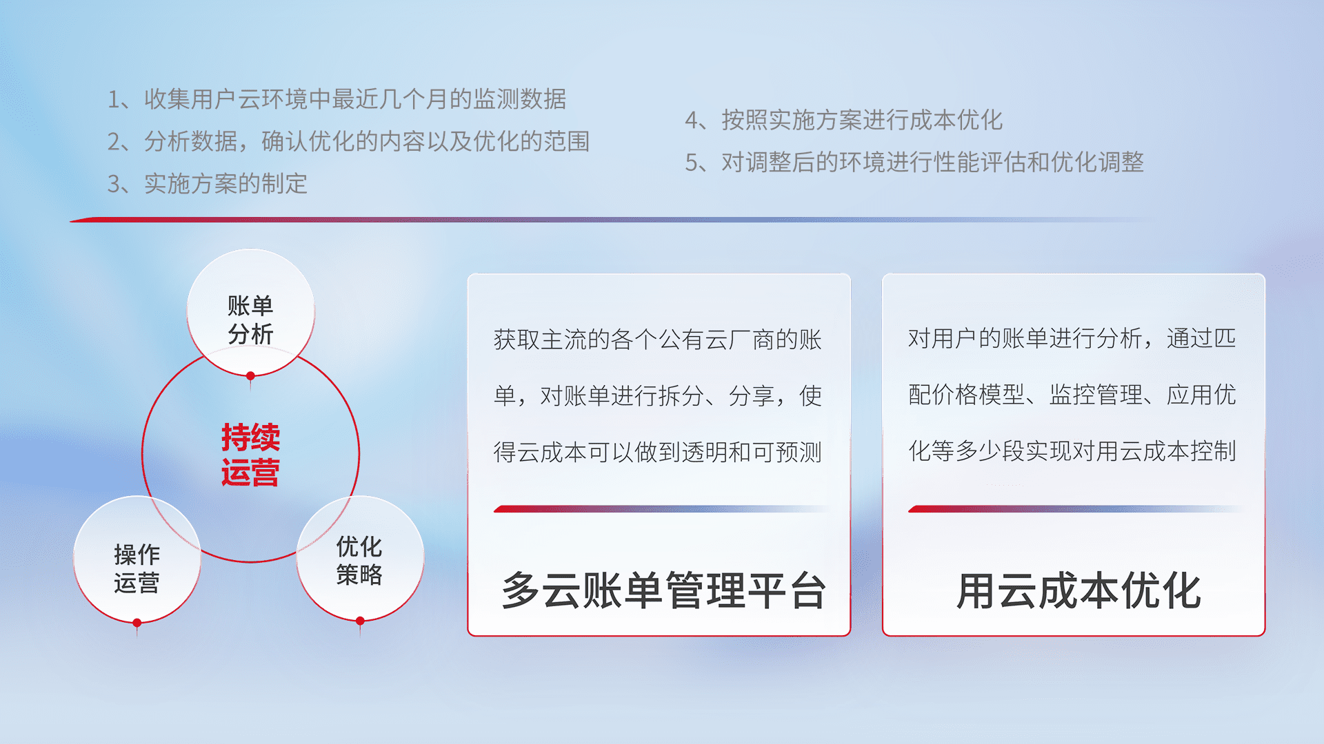 通过多云纳管,,,以统一的资源数据模型把客户的云资源进行抽象和封装,,,进而实现对多云资源的统一操作,,,保障云资源管理的可靠性、、稳定性与可用性。。。量身定制化运维内容,,配置、、、开发运维、、补丁管理、、、备份、、、监控、、、认证和访问管理、、、审计和日常巡检等,,,保障在用云过程中的可靠度,,,,稳定度以及高可用率。。